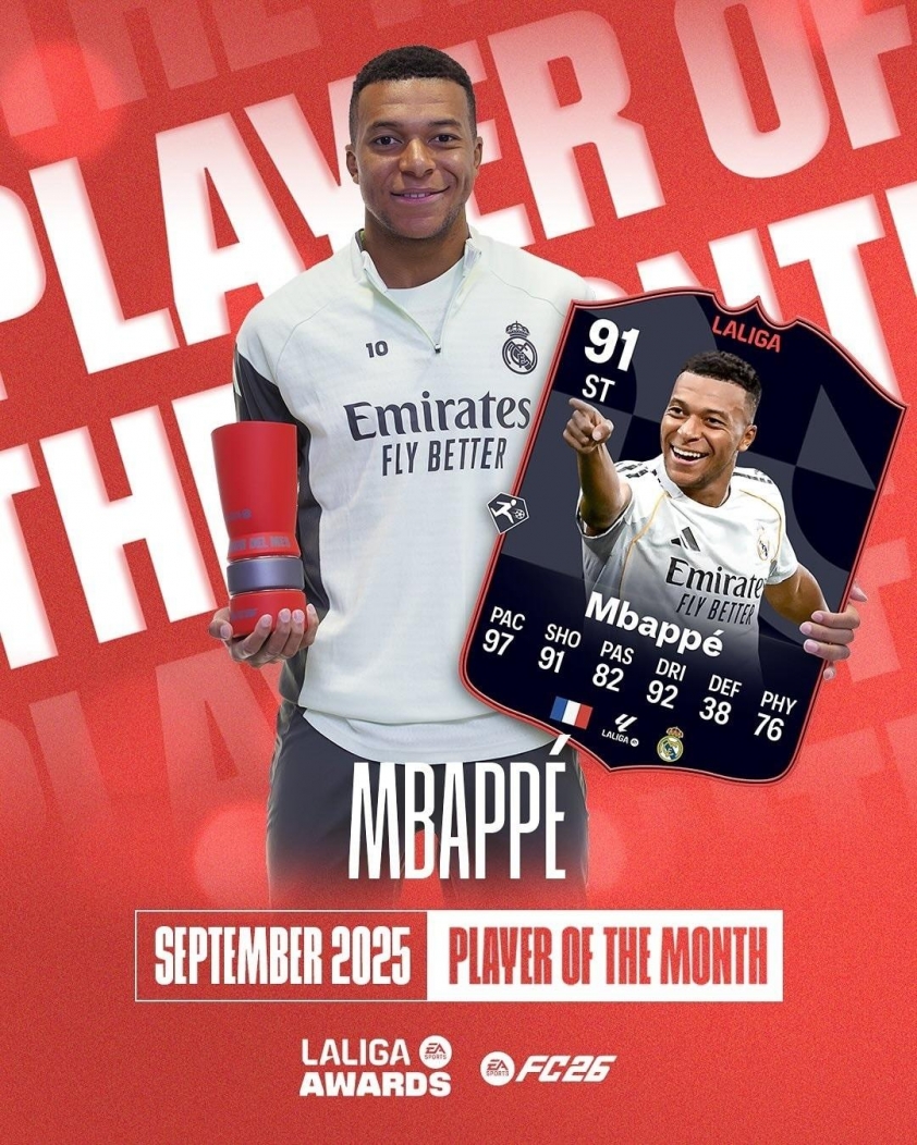 Not only impressing experts, this form also earned Mbappé two prestigious awards. First, he was named Real Madrid’s Player of the Month for September. This was the first time since arriving at Santiago Bernabéu that Mbappé was honored by the Madridista fans. He surpassed strong contenders such as Arda Güler, Vinicius Jr, Franco Mastantuono, and Eder Militao to win this award. Outperforming these names highlights Mbappé’s outstanding influence within Real Madrid’s star-studded squad.