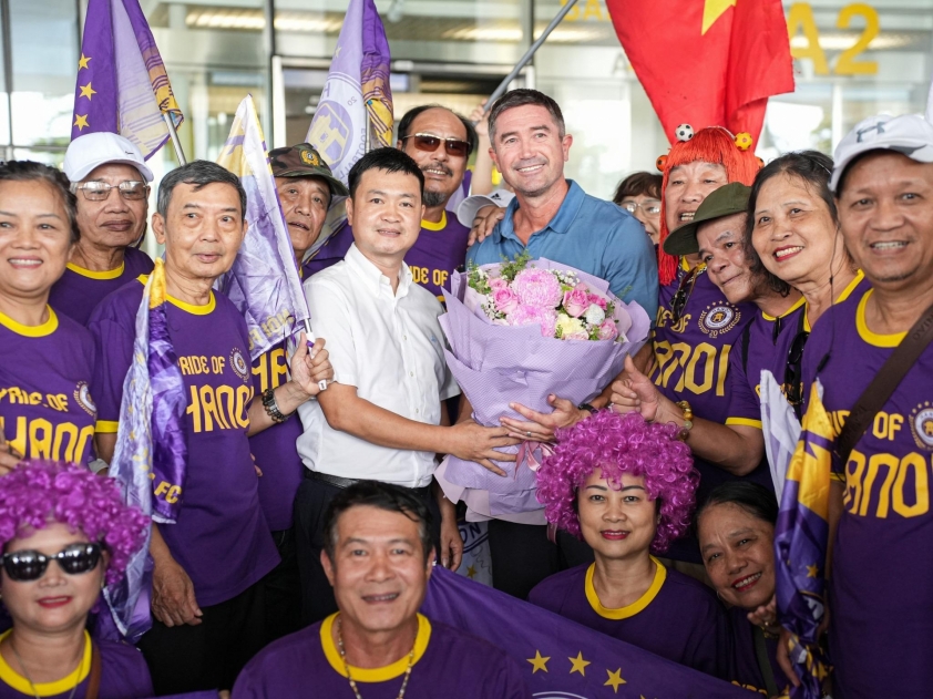 Many supporters dressed in purple gathered early at the international arrival area of Noi Bai Airport. They carried flags, banners, and numerous signs welcoming Harry Kewell to Hanoi FC. When the 47-year-old coach stepped into the hall, the crowd loudly chanted his name, creating a lively atmosphere rarely seen for a new foreign coach in Vietnam.