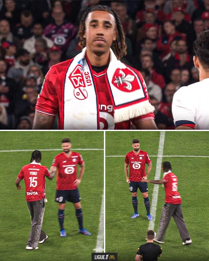 Wearing the home jersey with “Yoro 15” printed on the back, draped in the club’s scarf and dressed casually in jeans, the young man stepped onto the field to thunderous applause. He shook hands with Olivier Giroud – the 39-year-old French football icon currently leading Lille’s attack after years competing in the Premier League wearing Arsenal and Chelsea colors.