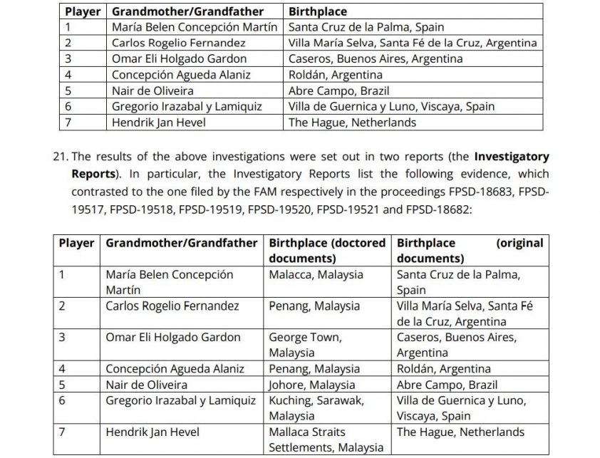FIFA has released evidence proving that the Malaysian origins of 7 players who were unlawfully naturalized are fake.