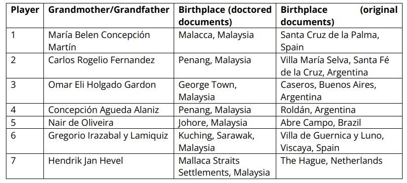 While the copies sent to FIFA stated birthplaces as Malacca, Penang, Johore, George Town, Kuching (locations in Malaysia), the originals showed actual birthplaces in Europe or South America, for example, Garcés’ grandfather was born in Santa Fé, Argentina, and Arrocha’s grandmother was born in Spain.