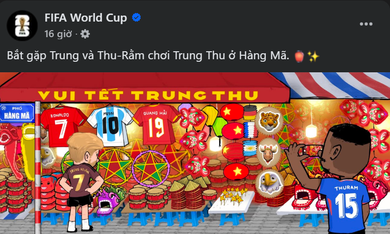 Accordingly, FIFA extended greetings to the Vietnamese people on the Mid-Autumn Festival, including an image of Quang Hải’s jersey placed next to those of two legends, Cristiano Ronaldo and Lionel Messi, along with the caption "Caught Trung and Thu-Rằm celebrating the Mid-Autumn Festival at Hàng Mã."