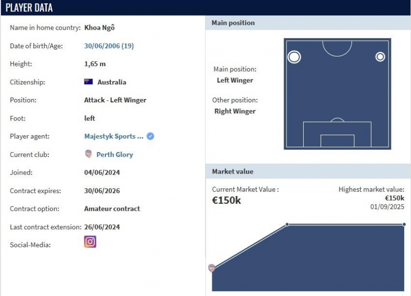 Born in 2006 in Australia to Vietnamese parents, Khoa Ngô showed early talent with the ball. Joining Perth Glory’s youth academy, the Vietnamese-Australian player gradually matured and made his first-team debut in the 2023/24 season.