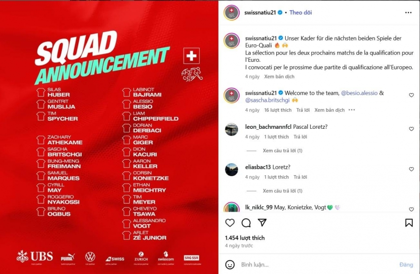 Being continuously called up to the Switzerland U21 team is not only a great honor but also an important stepping stone towards the senior national team in the future. Additionally, with his Vietnamese roots, Bung Meng Freimann attracts special attention from fans in his ancestral homeland, as he could become one of the most promising overseas Vietnamese players if he ever dons the Vietnam national team jersey.
