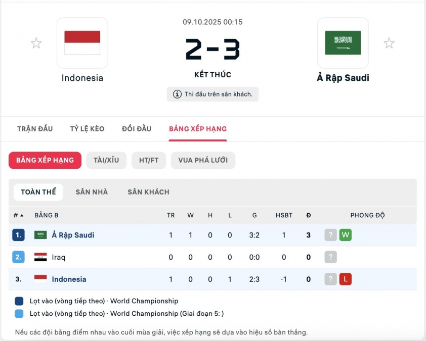 Overall, despite losing to Saudi Arabia, Indonesia still has a chance to top the group and qualify directly for the 2026 World Cup finals. Specifically, if Indonesia beats Iraq by a large margin in the next match and Iraq defeats Saudi Arabia in the final round, all three teams will end up with 3 points.
