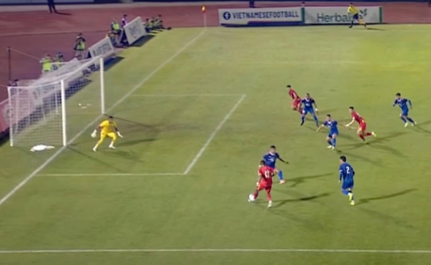 Hoang Duc curled a left-footed shot, but goalkeeper Kiran pushed it away. The ball fell to Van Vi, who fired a low follow-up shot straight into the net. The score is 3-1 for Vietnam.