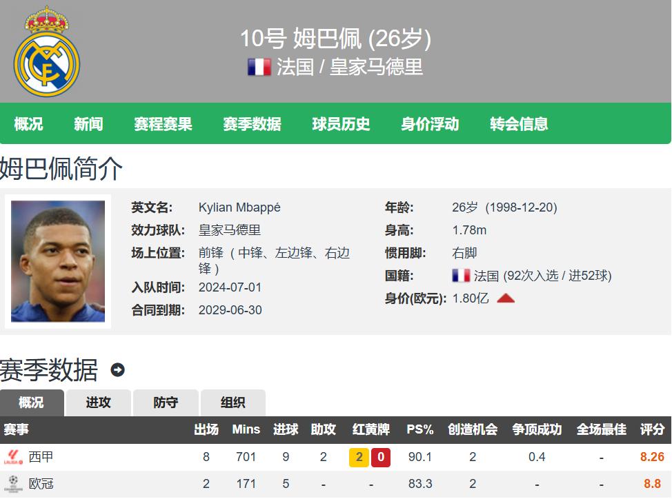 Mbappé, aged 26, is also valued at 180 million euros on Transfermarkt. This season, he has made 8 appearances in La Liga, scoring 9 goals and assisting twice; in the Champions League, he played 2 games and netted 5 goals; altogether, he has 14 goals and 2 assists in 10 matches across all competitions, demonstrating remarkable efficiency.