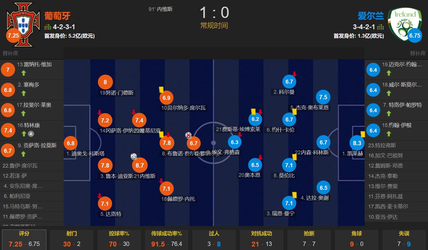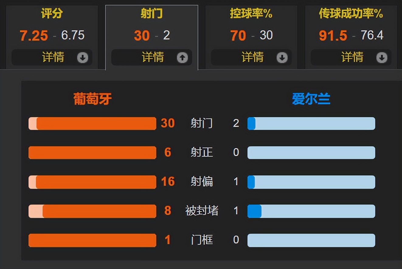 Throughout the match,Portugal controlled 70% possession and fired 30 shots, 6 on target; Ireland had only 2 shots in total, none on target.Ronaldo, Portugal’s lowest-rated starter, repeated his usual pattern by taking 7 shots—the most in the team—but missed a penalty and was ineffective. Whenever Ronaldo fails to score, he tends to receive the lowest rating, which is Portugal’s fundamental problem at present, yet he remains an indispensable starter.