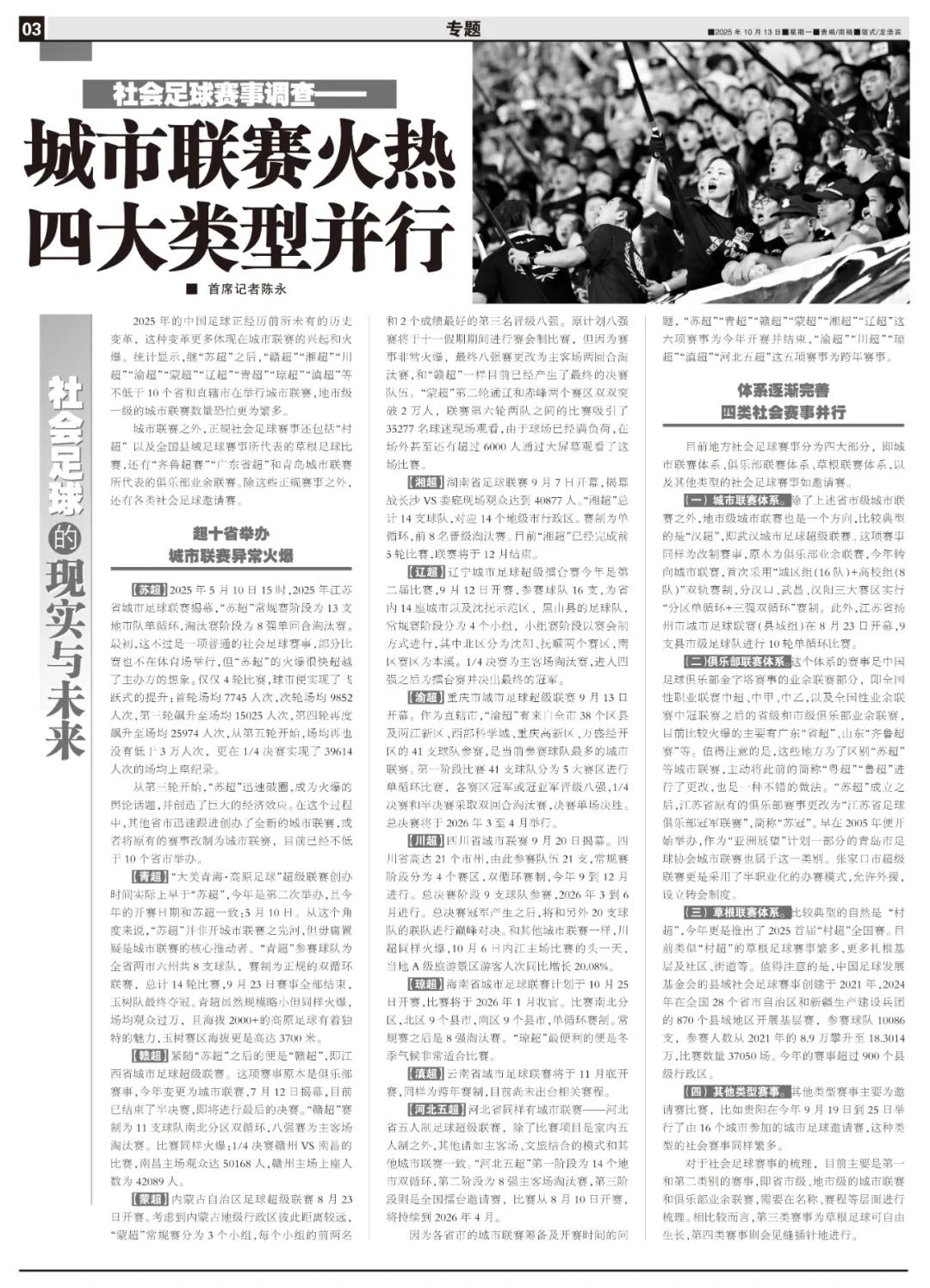 Chief Reporter Chen Yong reports In 2025, Chinese football is experiencing an unprecedented historic change, largely manifested in the emergence and boom of city leagues. Data indicates that following the "Su Super League," at least 10 provinces and municipalities such as "Gan Super," "Xiang Super," "Chuan Super," "Yu Super," "Meng Super," "Liao Super," "Qing Super," "Qiong Super," and "Dian Super" have launched city leagues, with even more leagues at the municipal level.