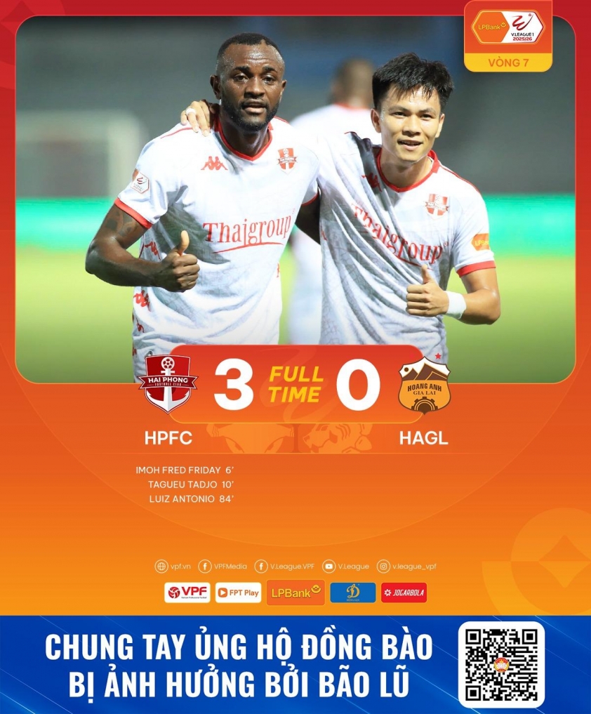 At Lạch Tray Stadium, Hải Phòng delivered a convincing performance by defeating HAGL 3-0 in round 7 of the 2025/26 V-League. Meanwhile, the Núi team continued their disappointing run, officially falling to the last place in the standings after 7 rounds without a win.