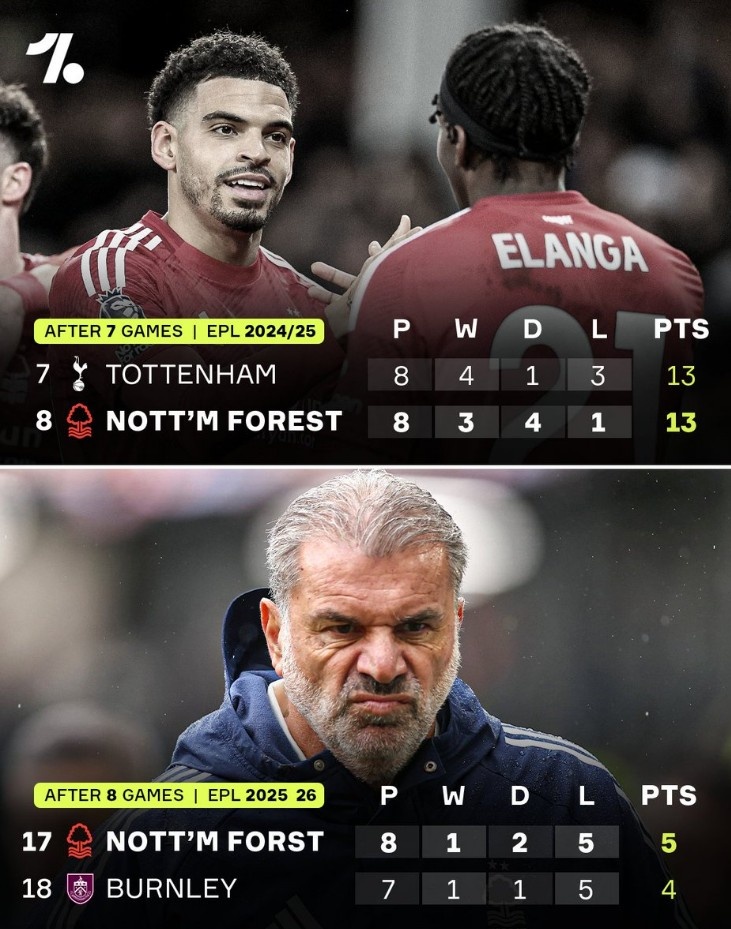 Last season, Nuno was the manager of Nottingham Forest and for a long time had the team ranked in the Premier League’s top three. However, they faltered in the final stretch, missing out on a top-five finish and Champions League qualification, though they did secure a spot in the Europa League. After disputes with the club’s owner, Nuno was dismissed. Nottingham Forest then appointed Postecoglou, who nearly relegated Tottenham last season, but following a 0-3 home defeat to Chelsea in this round, Postecoglou was sacked after just 39 days with zero wins. Nottingham Forest have now officially named former Everton boss Dyche as their new manager, marking a rapid decline from a European competition team to a relegation battler.