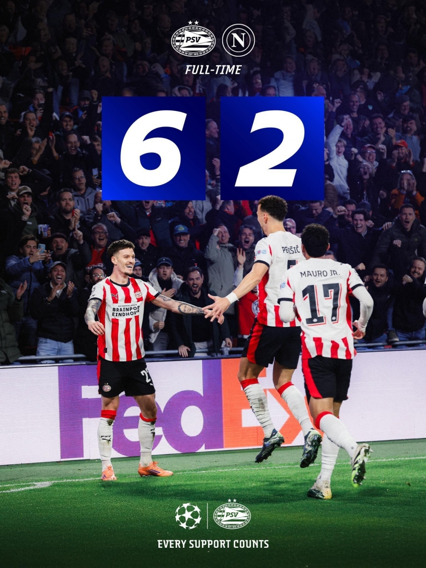 PSV Eindhoven made history at Philips Stadion by staging a comeback to crush Napoli 6-2, securing their first Champions League win this season. Despite trailing initially, the Dutch side played explosively, especially after Napoli was reduced to 10 men.