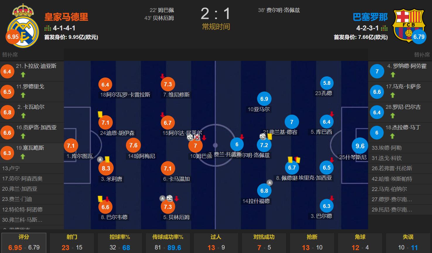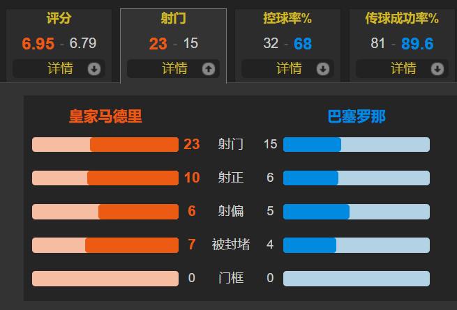 Throughout the match,Real Madrid had only 32% possession, took 23 shots with 10 on target; Barcelona had 15 shots with 6 on target..