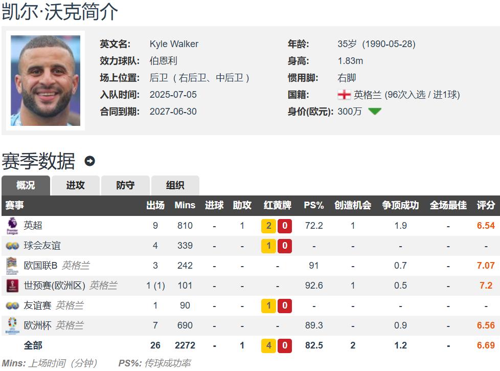 Walker, now 35 years old, is a veteran standing 1.83 meters tall, right-footed, primarily playing as a right-back, valued at €3 million, with a contract at Burnley until 2027. This season, he has started and completed all 9 Premier League matches for Burnley, providing one assist.
