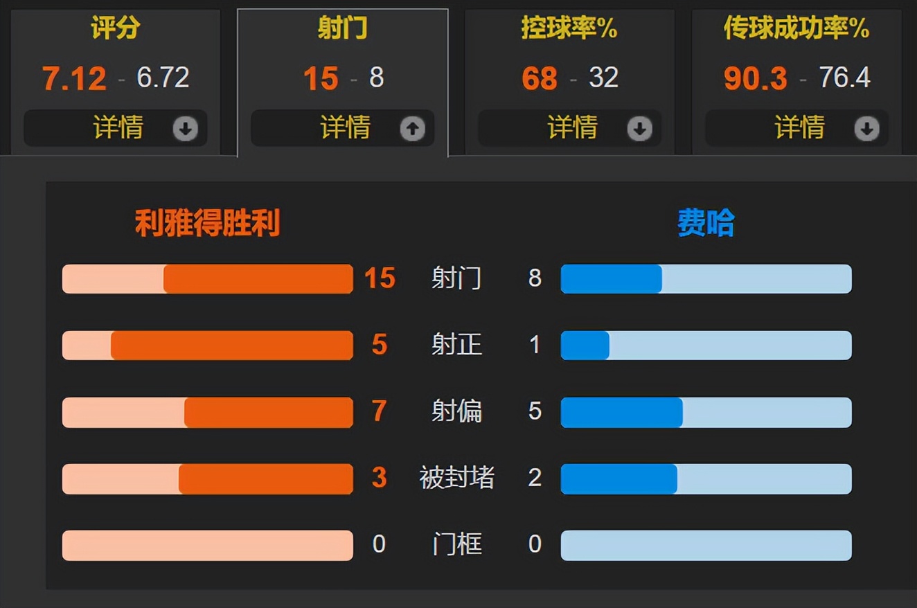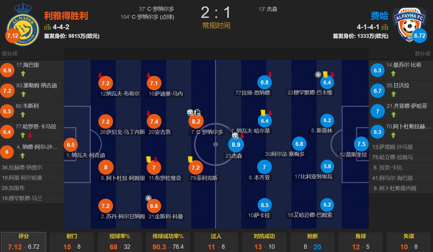 Throughout the match, Al-Nassr held 68% possession and had 15 shots, 5 of which were on target; Al-Fayha had 8 shots with only 1 on target.