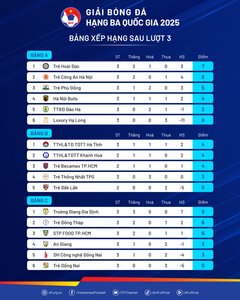 Earlier in two early matches, Tre CAHN achieved a resounding 6-0 victory over Luxury Ha Long, while Tre Hoai Duc held Tre Phu Dong to a 1-1 draw, leading Group A with 7 points and remaining unbeaten after three rounds.