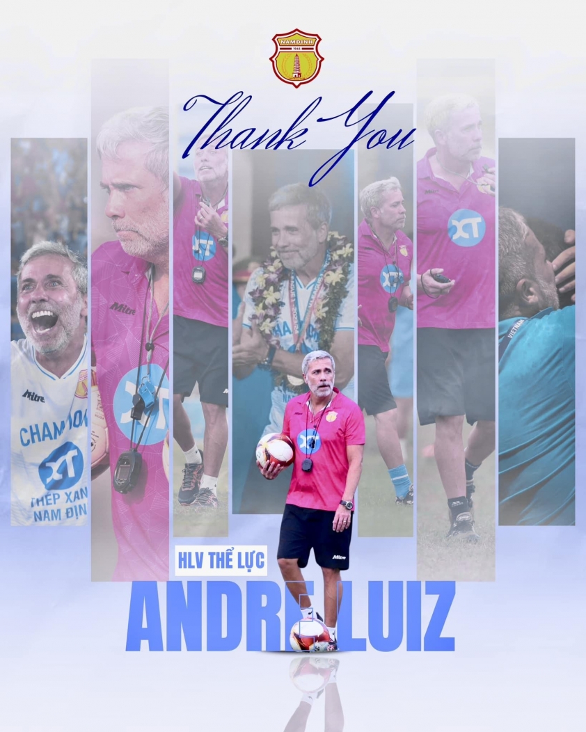 Shortly after winning the 2023/2024 championship, fitness coach Andre Luiz Lima departed. This season, Nam Định introduced another fitness coach at the start, Tiago Jose Almeida Goncalves. Fitness coach Tiago Almeida, born on February 4, 1984, is also Brazilian and brings extensive experience from working in Thailand, UAE, South Korea, and Germany.