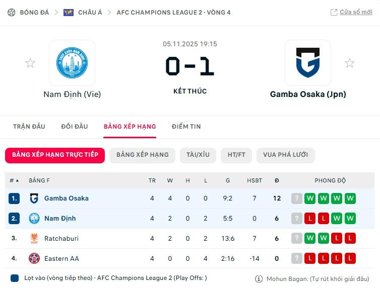 Overall, Nam Định’s chances to advance are very high. However, to be certain, they need at least a point against Ratchaburi in the fifth round before aiming for a win over Eastern AA in the final match. In the AFC Champions League Two group stage, the top two teams qualify for the next round. Currently, Gamba Osaka has already secured qualification with 4 wins out of 4 matches.