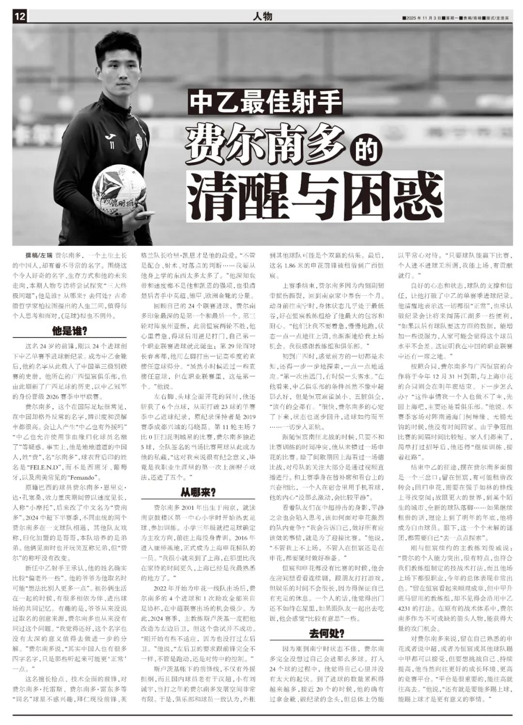 For Fernando, staying with familiar Shenhua or playing in the Super League, or competing in League One for Hengchen or other clubs, are all acceptable. But to challenge himself and keep improving, he naturally yearns for a better growth environment and a higher competitive platform. “The platform is very important; if you can go higher, you should go higher,” he said. “Also, getting more playing time is the most meaningful thing.”