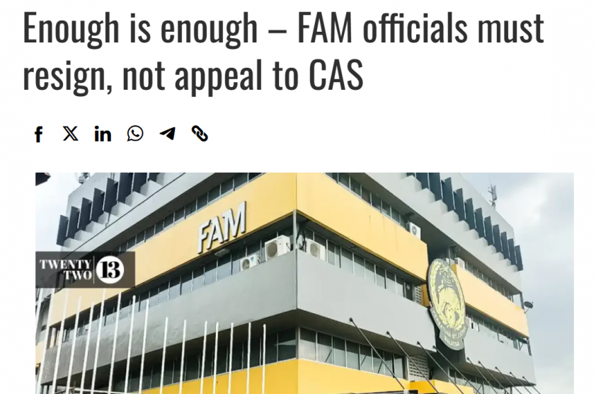 "It is time for the entire FAM leadership to resign en masse This is not only an ethical demand but a prerequisite for Malaysian football to restart. A team that has lost public trust cannot continue to govern, nor can it restore its lost reputation "