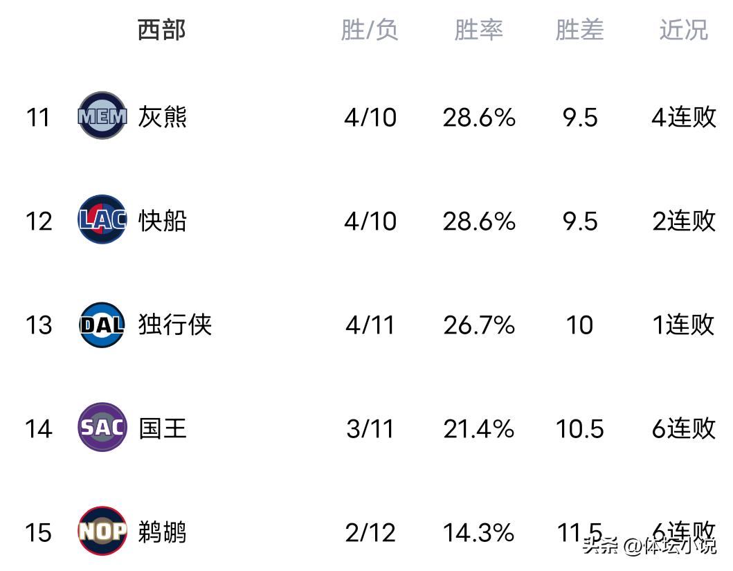 On November 18th Beijing time, the NBA regular season continued with several key games: the Clippers fell to the 76ers 108-110, the Mavericks suffered a heavy 96-120 defeat against the Timberwolves, the Thunder dominated the Pelicans 126-109, and the Bulls' reserves sparked a 130-127 upset over the Nuggets, who had won 7 in a row. Consequently, the newest Western Conference standings show the Thunder on a 6-game winning streak in first place, the Timberwolves sixth, the Clippers dropping to 12th after two losses, and the Pelicans at the bottom with 6 straight defeats!