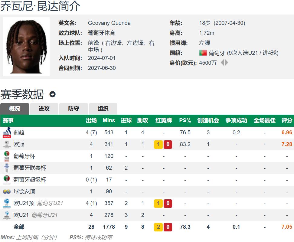 Kunda is currently 18 years old, stands 1.72 meters tall, is left-footed, and primarily plays as a right winger but can also operate as a left winger or right midfielder. Transfermarkt values him at 45 million euros. This season, Kunda has made 18 appearances for Sporting CP across all competitions, starting 10 matches and contributing 4 goals and 6 assists.