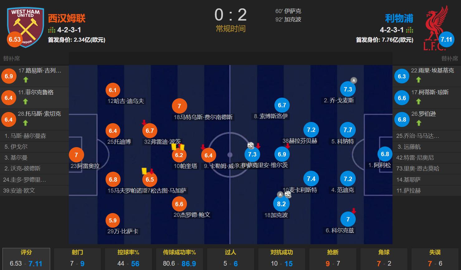 West Ham United vs Liverpool, Nuno deployed a 4-2-3-1 formation with Wilson up front, Paqueta behind him, Bowen and Matheus on the wings, Magassa and Potts anchoring midfield, Wan-Bissaka, Mavropanos, Todibo, and Diouf forming the back four, Areola in goal, with a total starting lineup value of 234 million euros;Slot set up a 4-2-3-1 formation, Isak leading the attack, Wirtz behind him, Gakpo and Szoboszlai on the flanks, McAllister and Gravenberch as double pivots, Kelleher, Van Dijk, Konate, and Joe Gomez in defense, Alisson guarding the goal, with a starting lineup worth 776 million euros..