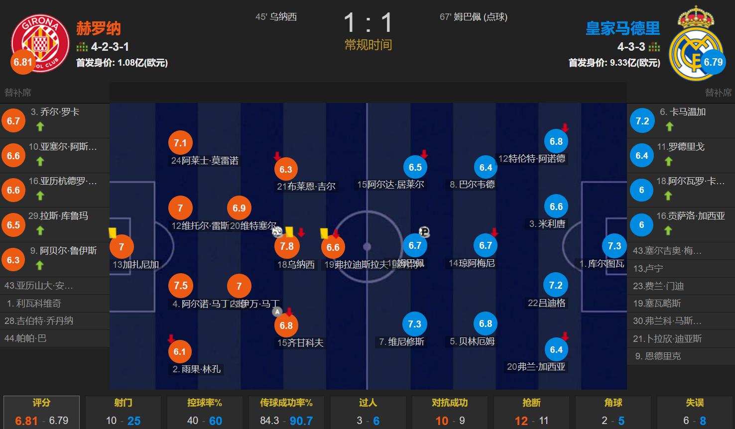 In the first half, Mbappé’s goal was ruled out for offside, then Onana scored to put Girona ahead, with Real Madrid down 0-1 at the break; in the second half, Vinicius earned a penalty, which Mbappé successfully converted to level the score.