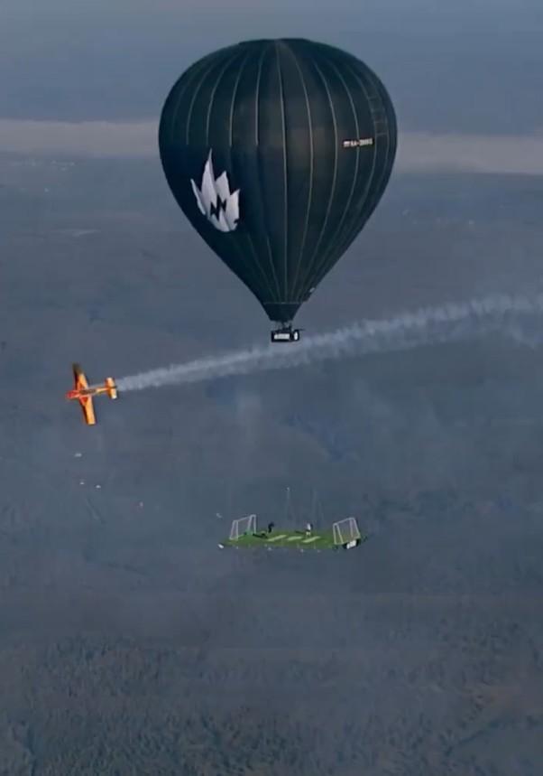 A video that has been widely shared on social media recently shows an incredible scene: Russian daredevil Sergey Boytcov playing football 1800 meters above the ground. This is not a stadium or a crowd-filled arena performance, but rather on a “football field” suspended in mid-air, attached to a gigantic hot air balloon designed to set a world record.