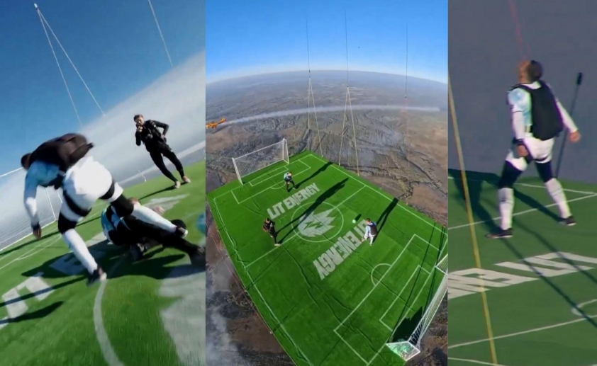In the video, Boytcov performs various technical moves, passes, and shots right in mid-air. A goal is scored amid strong winds and a constantly shaking surface, creating a stunning moment for viewers. The most remarkable part is when, after scoring, the athlete jumps and recreates Cristiano Ronaldo’s famous “siuuu” celebration (a spinning airborne move followed by a strong stomp) at nearly 6,000 feet high, making the scene extremely impressive and surreal.