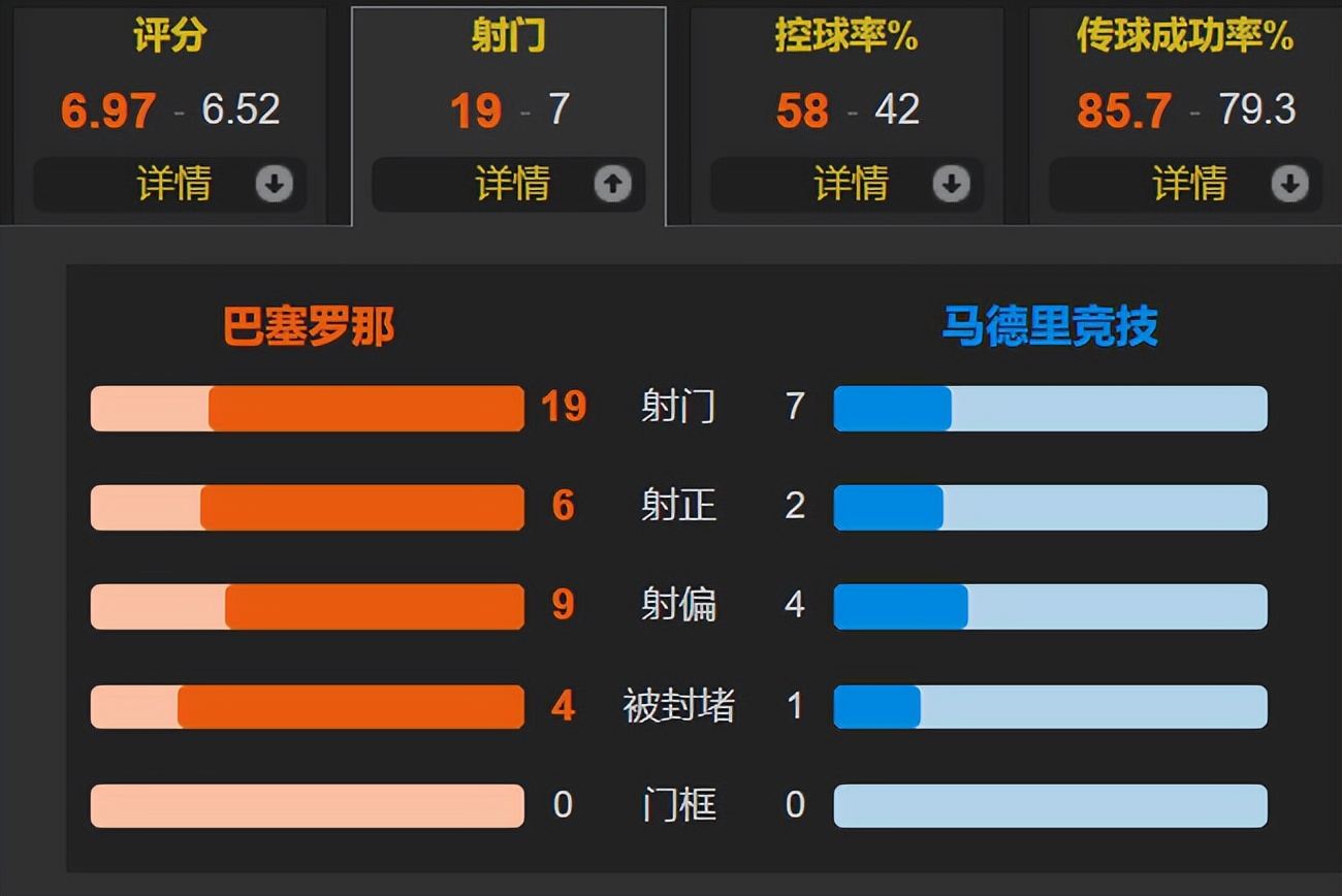 Throughout the match,Barça held 58% possession, made 19 shots with 6 on target; Atlético had 7 shots with 2 on target..