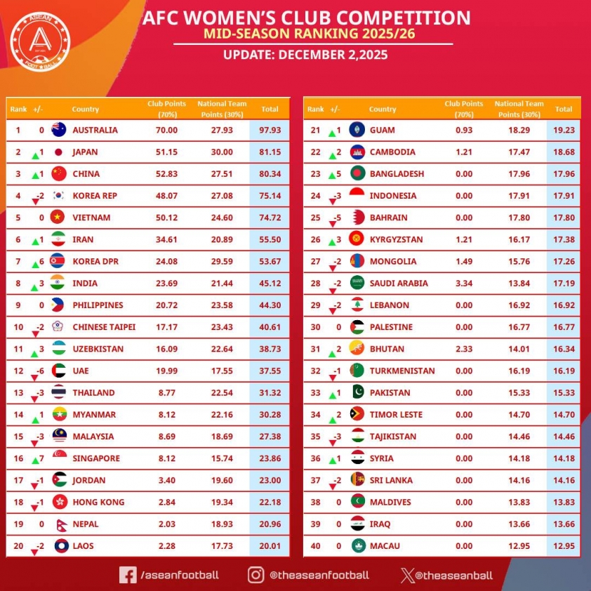 According to the latest mid-season 2025/26 ranking of Asian women's clubs, Vietnam continues to excellently secure the 5th spot in Asia with 74.72 points (the national team contributed 24.6 points while Ho Chi Minh City I club contributed 50.12 points), thereby affirming its leading position in the Southeast Asian arena.