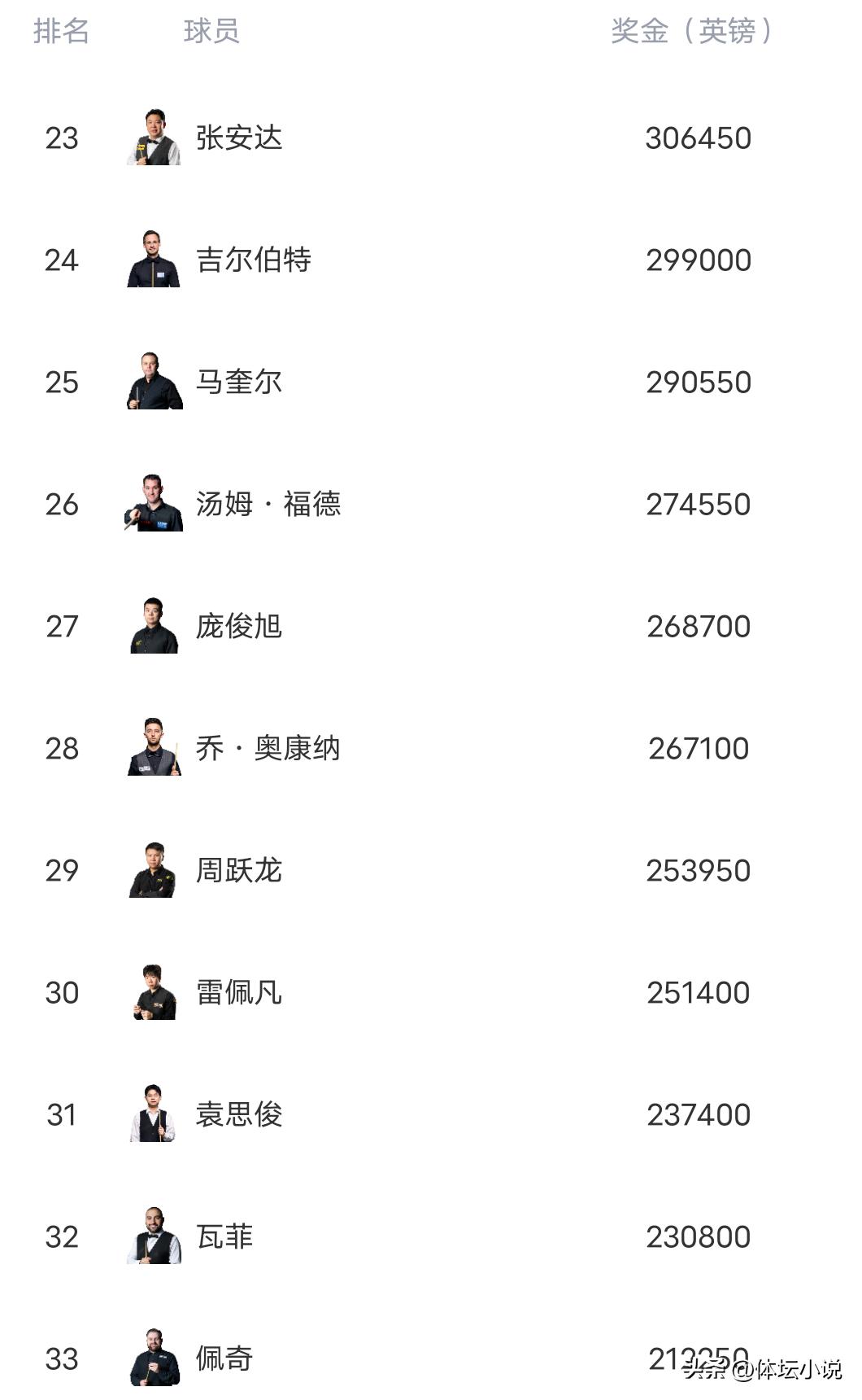 The Chinese contingent had 12 players qualify for the main draw in this event, but none advanced to the quarterfinals, still struggling against the "Big Four" from the 80s generation. Currently, five Chinese players remain in the top sixteen: Zhao Xintong leads at tenth, followed by Xiao Guodong at eleventh, Ding Junhui dropping to twelfth, Wu Yize at thirteenth, and Si Jiahui at fifteenth. It’s interesting that four of them share very close rankings!