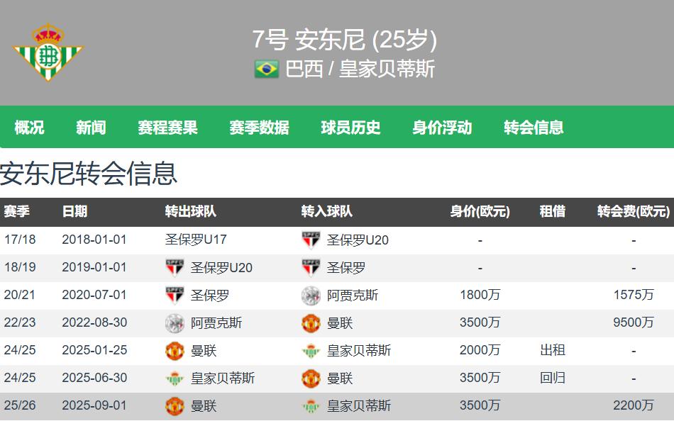 Now 25 years old, Antony stands 1.72 meters tall, is a left-footed right winger, and is contracted with Real Betis until 2030. His market value is estimated at €30 million by Transfermarkt, which is expected to rise when La Liga player valuations update this Friday.