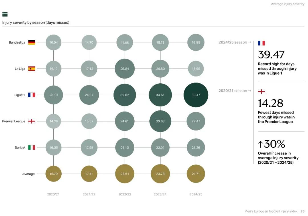 Additionally, the Howden report categorizes players into four age groups: under 21, 21-25, 26-30, and over 30, and calculates the average injury duration for players who played at least 300 minutes per season. Over the past five seasons, the average playing time for U21 players in the top five leagues rose from 414 minutes to 523 minutes, with a notable increase in injuries. The average injury duration for U21 players jumped from 16.77 days before the 2020/21 season to 30.25 days in the 2024/25 season. By contrast, the 21-25 age group’s average injury duration in 2024/25 was only 21.76 days. The peak injury absence for U21 players was in the 2023/24 season (35.37 days), far exceeding the other three age groups.
