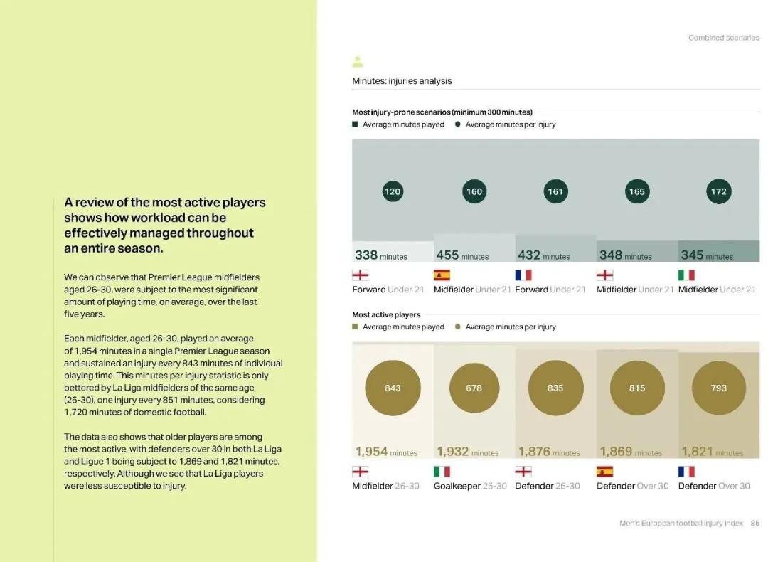 On December 16, British company Howden Insurance released the “2024/25 European Football Injury Report.” This comprehensive 286-page report revealed the staggering “injury costs” in the top five leagues: over the past five seasons, there have been 22,596 injury incidents across these leagues, with clubs incurring a total “injury cost” of 3.446 billion euros. Injuries in Premier League clubs accounted for 24% of the total incidents, but their “injury costs” (1.379 billion euros) made up 40%, exceeding the combined totals of La Liga (601 million) and the Bundesliga (580 million).