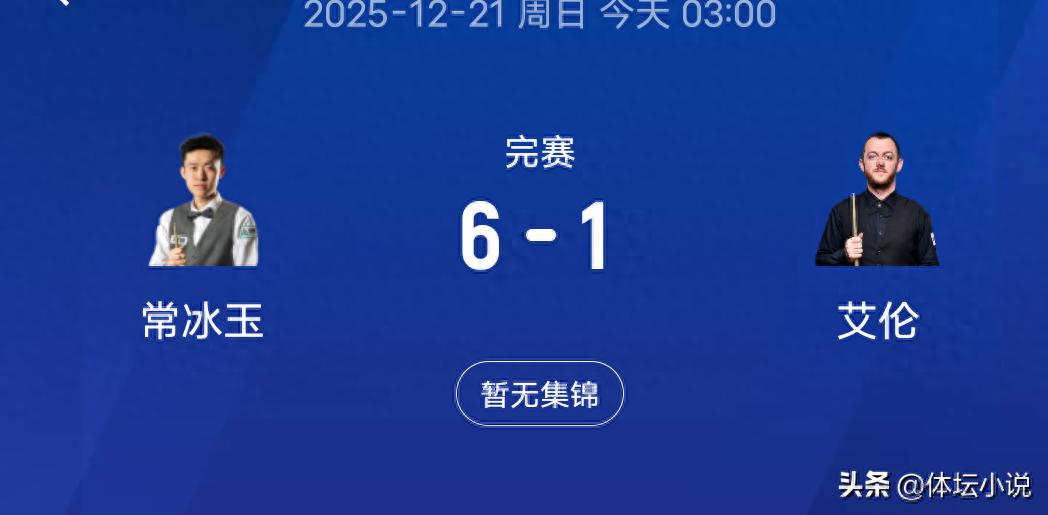 Chang Bingyu faced Mark Allen. The skill gap was significant, with Chang emerging as the tournament’s dark horse after consecutively defeating several top sixteen players. Although Allen was favored to win today, Chang came out aggressively, winning the first three frames straight to start 3-0. Allen managed to take one frame before the break, ending the first half 1-3. In the second half, Chang’s precision remained sharp, leaving Allen on the sidelines. Ultimately, Chang delivered another three-frame streak to win decisively 6-1, completely overwhelming Allen. This marks Chang’s fourth consecutive elimination of top sixteen opponents and his first-ever final appearance in a ranking event—an achievement of great significance!