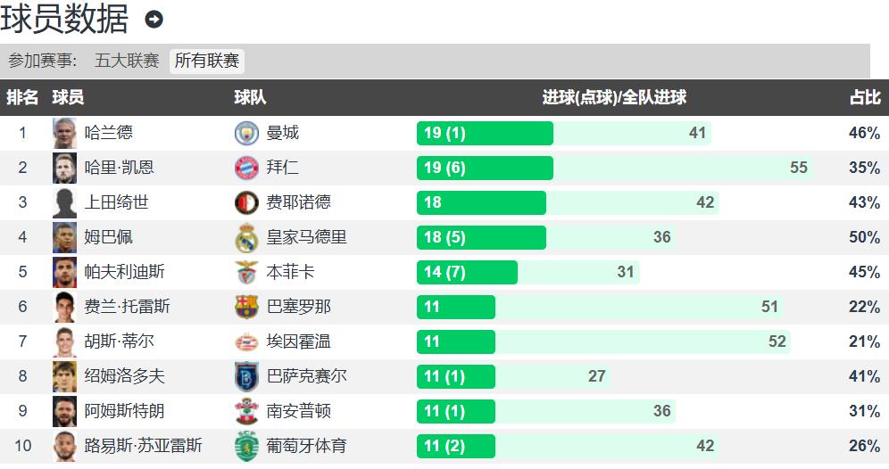 Because the coefficient for the top five leagues in Europe is 2 in the Golden Shoe rankings, the 2026 European Golden Shoe race essentially comes down to these three players: Kane, Haaland, and Mbappé. It’s worth noting that the Bundesliga has 18 teams, compared to 20 teams in the Premier League and La Liga, meaning the Bundesliga season has 4 fewer matches than the other two leagues, which puts Kane at a disadvantage in the Golden Shoe competition. These three have also been the Golden Shoe winners for the past three years, truly the super trio of the top five leagues, with scorching form and incredible consistency.
