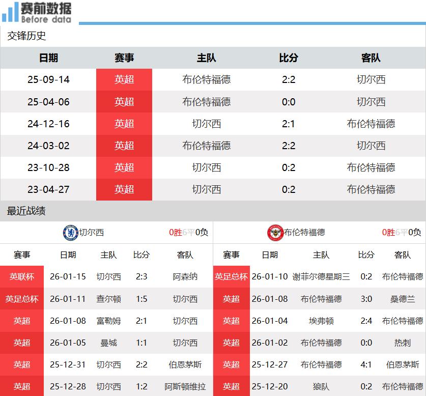 First:Team StatusAfter 21 rounds of the Premier League, Chelsea has 8 wins, 7 draws, and 6 losses, accumulating 31 points and ranking eighth, while Brentford has 10 wins, 3 draws, and 8 losses with 33 points, placed fifth. In the last Premier League round, Chelsea lost 1-2 away to Fulham, failing to win in the last 5 league matches with 3 draws and 2 losses. They then advanced in the FA Cup with a 5-1 away win over Charlton and lost 2-3 at home to Arsenal in the first leg of the League Cup semi-final midweek. Brentford won 3-0 at home against the newly promoted Sunderland, remaining unbeaten in their last 5 league games with 4 wins and 1 draw, and later advanced in the FA Cup with a 2-0 away victory over Sheffield Wednesday.