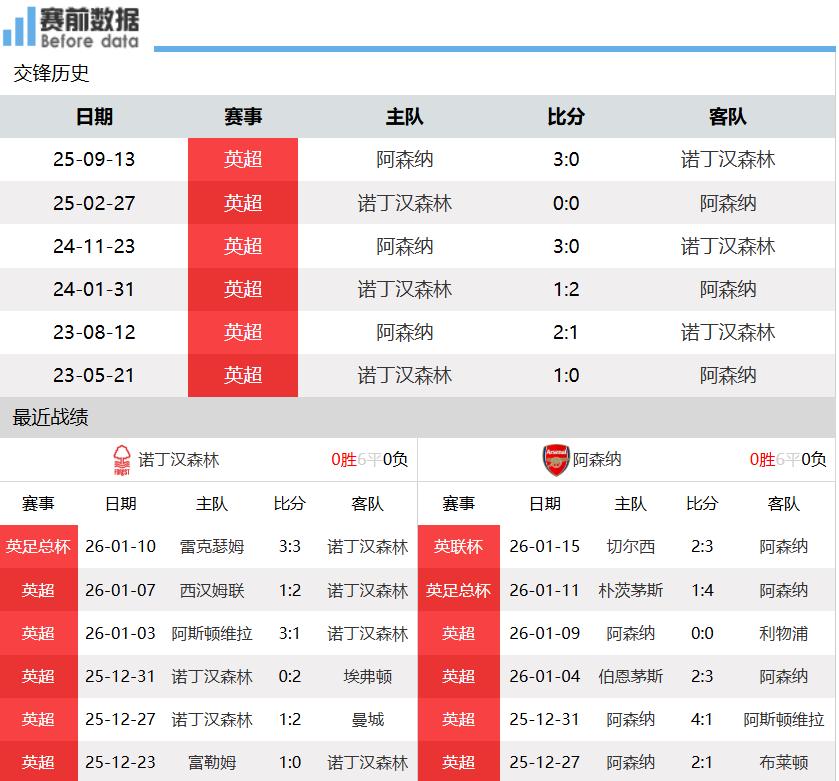 At 01:30 on January 18th Beijing time, in the 22nd round of the Premier League, Nottingham Forest will play Arsenal at home.