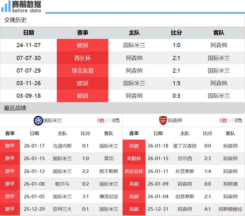 At 4 AM Beijing time on January 21, the 7th round of the Champions League group stage features a high-profile showdown, a battle among the top six in the Champions League, and a clash between the leaders of Serie A and the Premier League as Inter Milan hosts the Champions League table-toppers Arsenal.