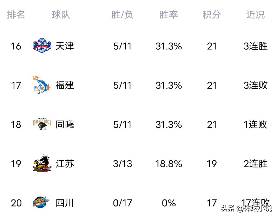 On January 19th Beijing time, the 17th round of the CBA regular season began. Last night saw four matches finish: Guangzhou dominated Beikong 104-75, giant killer Jilin lost to Shandong 68-77, Sichuan was overwhelmed by powerhouse Guangdong 76-104, and Guangsha, in excellent shape, beat Qingdao 90-75. Consequently, the latest standings have been updated with Guangsha in first place after 6 straight wins, Guangdong second, Shanghai third, Qingdao fourth, and Shandong fifth!