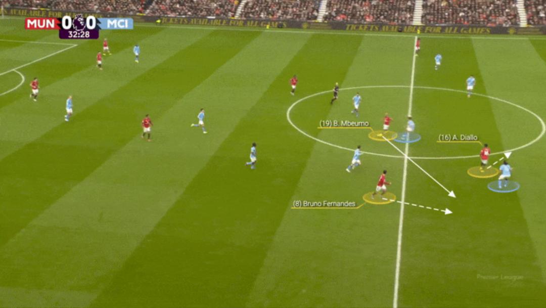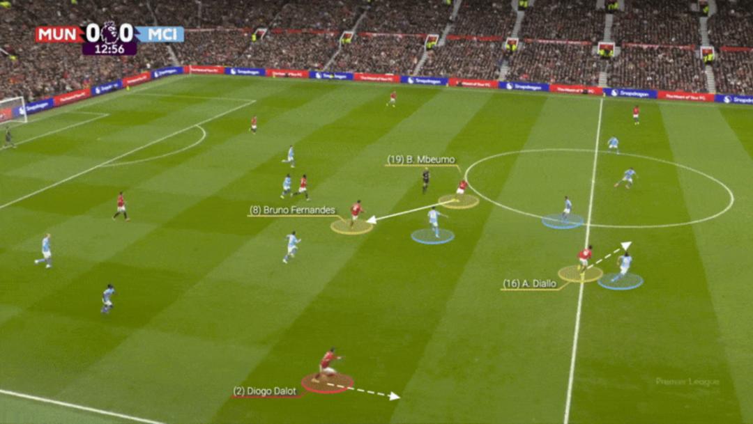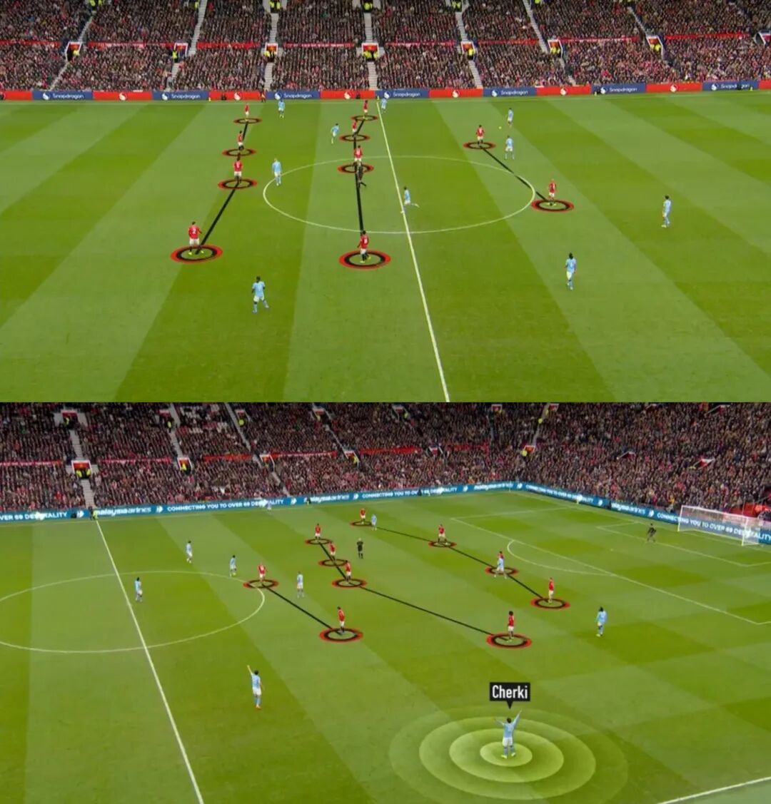Offensively, Carrick and his coaching staff deployed a strikerless formation, using constant positional rotations to exploit spaces behind City’s midfield and defenders. Mbemo, positioned as a center forward, dropped back while Bruno Fernandes, Amad Diallo, Patrick Dogu, and even fullback Diogo Dalot moved dynamically to create openings.