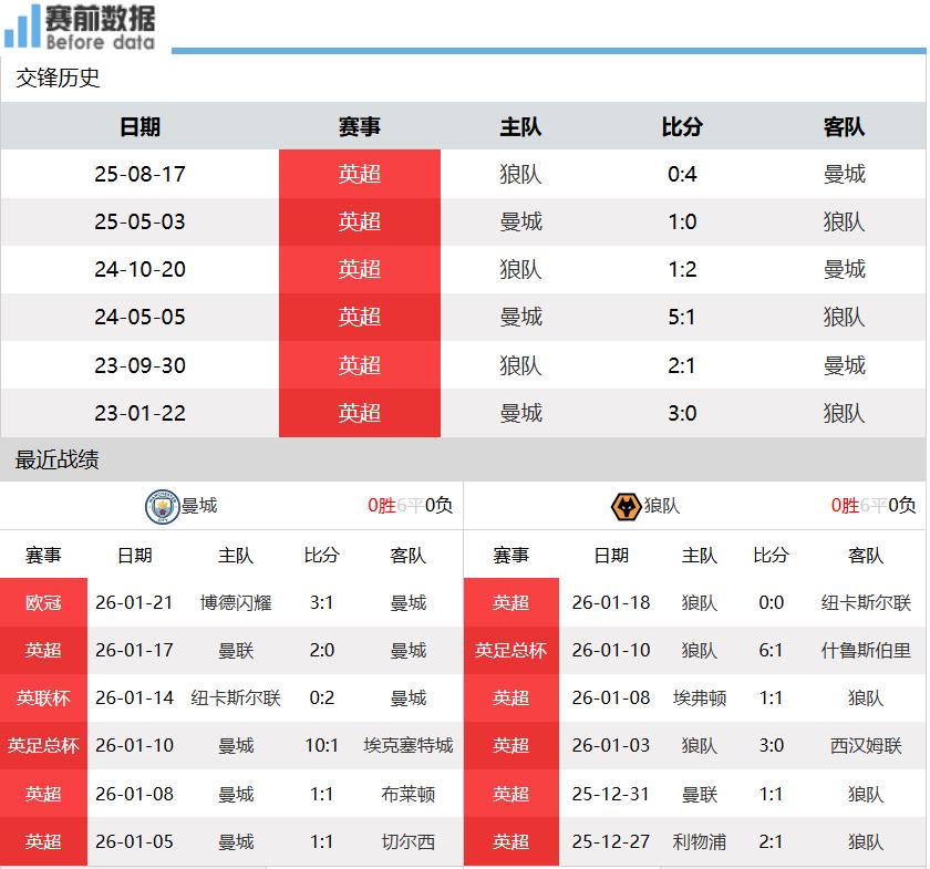 First:Team situations! After 22 rounds of the Premier League, Man City holds 13 wins, 4 draws, and 5 losses with 43 points, ranking second and 7 points behind Arsenal at the top, effectively out of the title race; Wolves have only 1 win, 5 draws, and 16 losses, sitting last with 8 points. In the last round, Man City suffered a 0-2 away defeat to Man United. Without the help of the post and multiple saves by Donnarumma, it would have been a disaster. In the midweek Champions League, Man City was upset 1-3 away by Bodø/Glimt, who recorded their first win of the season, making Guardiola a creator of upsets. The whole team’s form is poor; Wolves drew 0-0 at home against Newcastle and remain unbeaten in their last 5 matches across all competitions with 2 wins and 3 draws, including 1 win and 3 draws in their last 4 Premier League games, showing signs of revival.