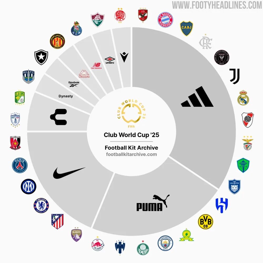 Although brands like New Balance, Under Armour, Macron, and Asics have grown rapidly and entered the football market, none have challenged Puma’s “third pole” status. At the 2025 Club World Cup, Adidas (11 teams), Puma (7 teams), and Nike (6 teams) will collectively sponsor 75% of the 32 participating teams, with the remaining 8 teams divided among 7 other brands.