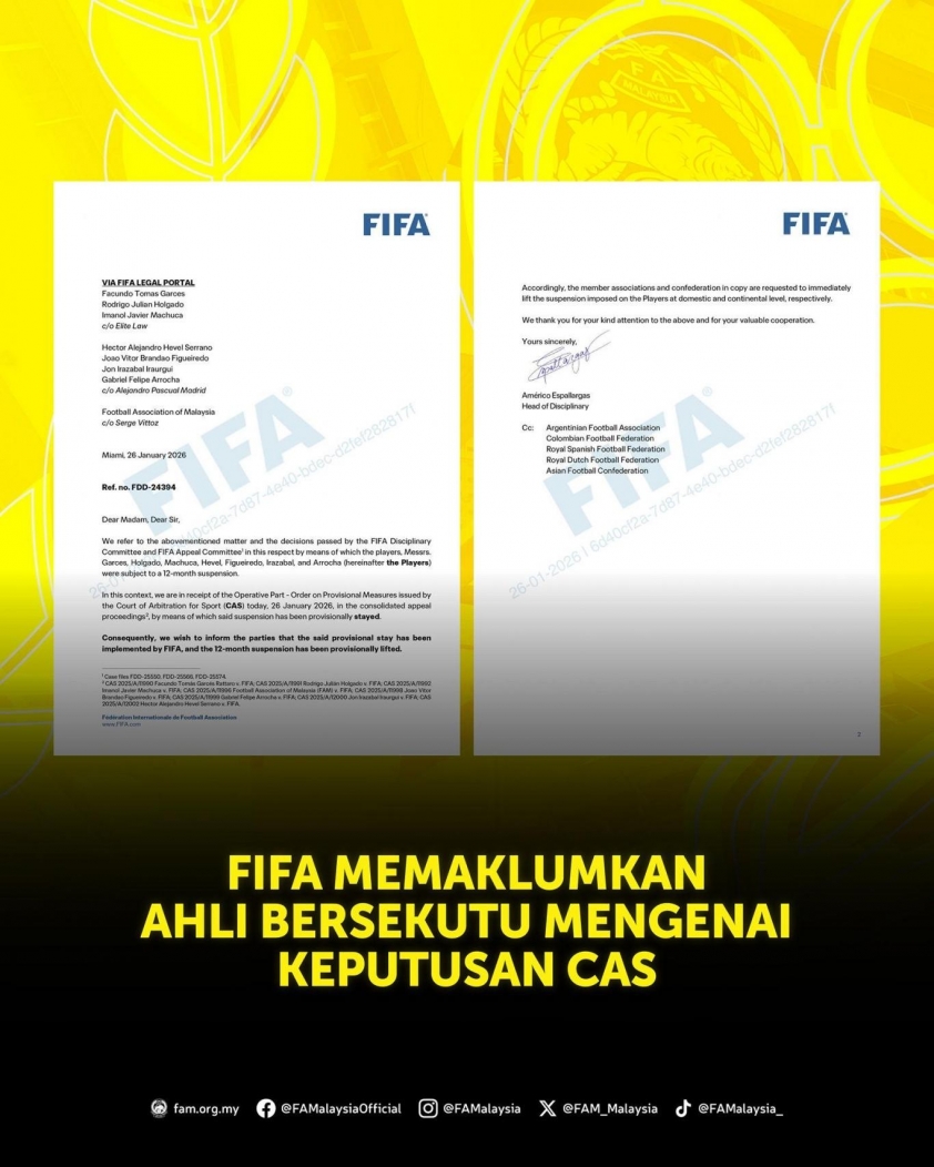 The Football Association of Malaysia (FAM) confirmed receiving a letter from FIFA announcing the temporary halt of sanctions against the seven naturalized players. This decision follows the Court of Arbitration for Sport (CAS) approving a stay of execution, allowing the players to continue competing while awaiting the final ruling.