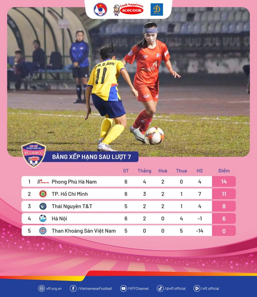 This win in round 7 allows Phong Phú Hà Nam to temporarily top the standings after 7 matches, while Hà Nội continues to closely follow the leaders with steady form. National Women's Football Championship – Acecook Cup 2026 thus witnessing an increasingly exciting and unpredictable race among the top contenders.