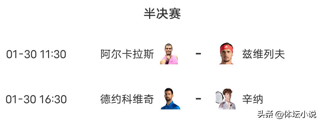 With these results, the semifinalists for this tournament are finalized, with the top four seeds sweeping the spots. The semifinals promise to be peak-level showdowns. According to today's schedule, the finalists will be decided in two back-to-back matches: Alcaraz will face Zverev, aiming to improve his personal best at the Australian Open and reach the final, while Sinner battles Djokovic, striving to defend his title and reach the final. Let’s stay tuned!