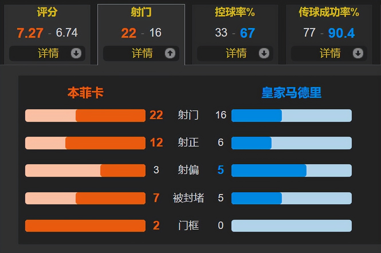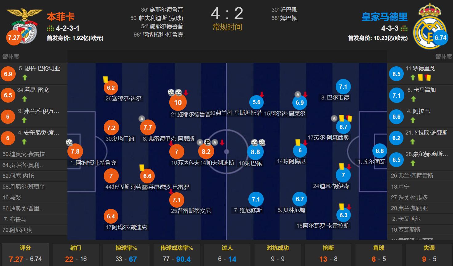 Match statistics show Benfica’s clear dominance over Real Madrid. Although Benfica’s possession was only about 33%, they had 22 shots, 6 more than Madrid’s 16, with 12 on target—twice Madrid’s 6—making Benfica’s 4-2 victory a very justified result.