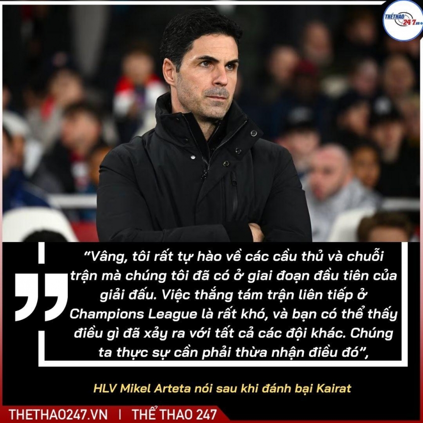 Arsenal made history with 8 consecutive wins in the Champions League, and coach Mikel Arteta affirmed that this achievement reflects the true character, stability, and ambition of the "Gunners".
